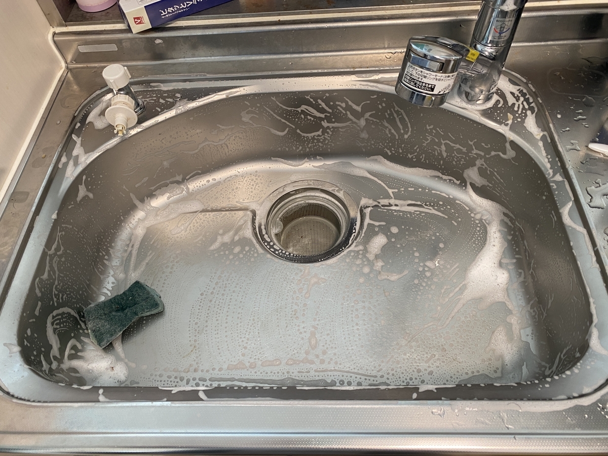 洗剤やスポンジを使って、シンクの汚れを落としておきます。