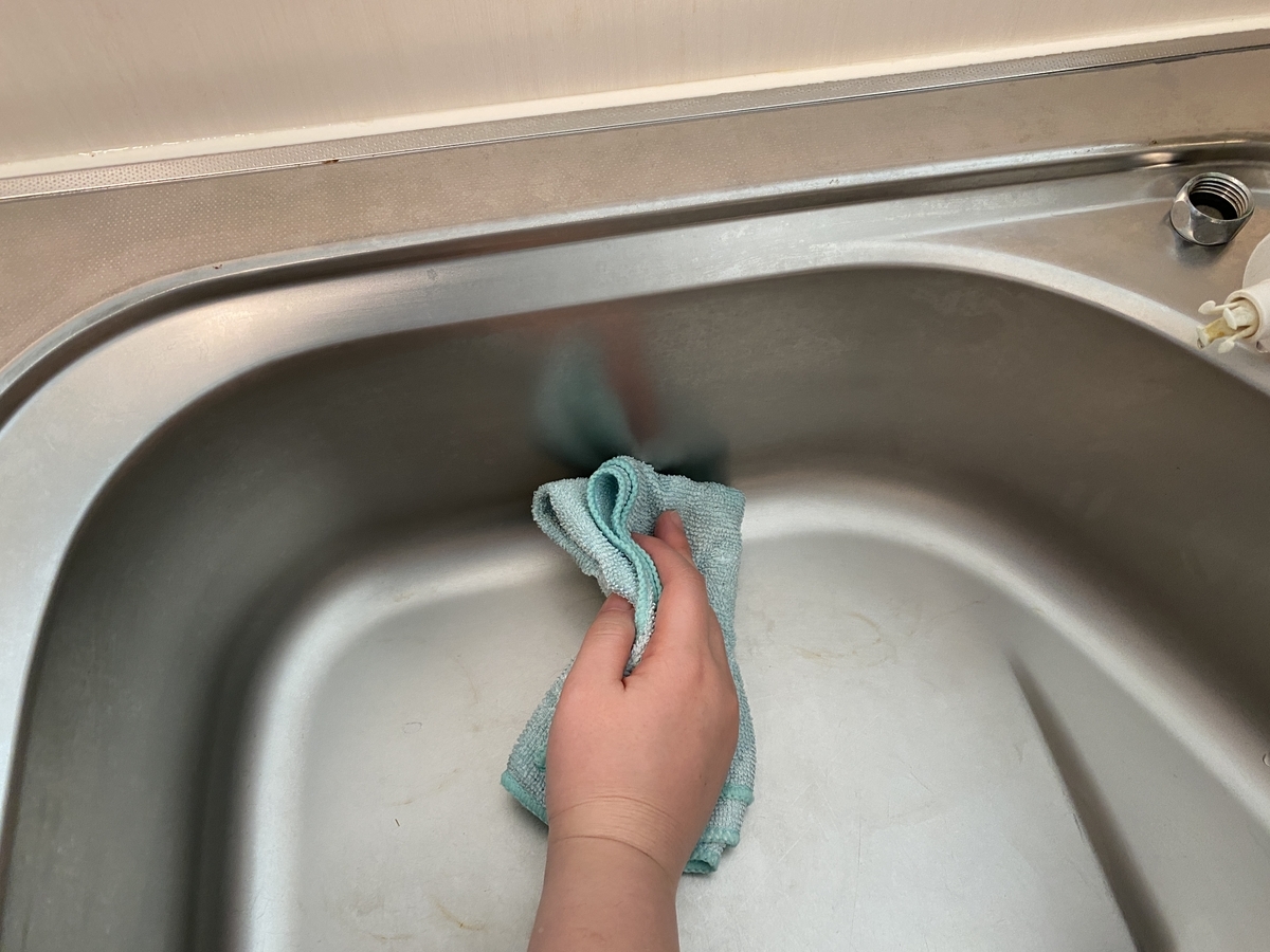 シンクに水分が残っていると撥水スプレーの効果が落ちるので、よく乾かしましょう。水滴を自然乾燥させると水アカの元となるので、ふきんなどで拭き上げるとよりきれいになります。