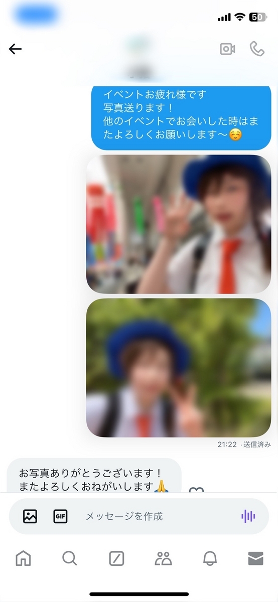 コスプレイヤー同士で撮影したセルフィーのツーショット写真(通称ツーショ)はDMに直貼りで送ることが多いように思います。